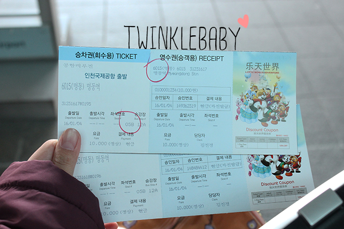 ออกมารับกระเป๋าเสร็จก็มาซื้อตั๋วแอร์พอร์ตบัสค่ะ ใบละ 10,000 วอน
