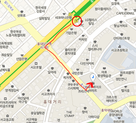 จนเกือบถึงหน้ามหาลัย พิกัด 37.558680, 126.945236 ส่วนเส้นทางดูตามแผนที่เลยค่ะ หาไม่ยาก