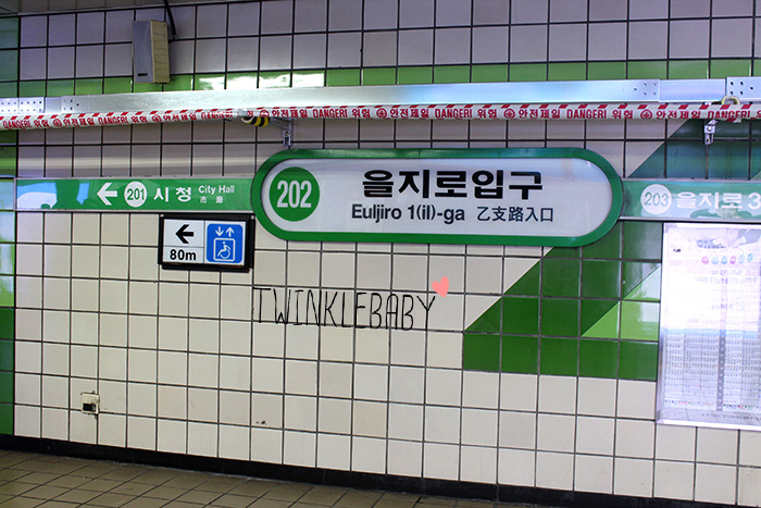 ชื่อสถานี Euljiro-1(il)ga หรือคนเกาหลีจะอ่านว่าอึลจิโรอิบกู (을지로입구) แต่ถ้าจำง่ายๆ เอาก็จำเลข 1 ไว้ค่ะ