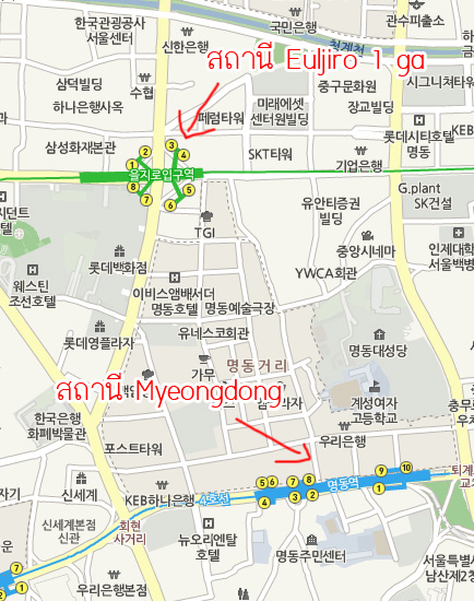 ขออธิบายนิดนึงค่ะ ตรงย่านมยองดงตรงนี้ จะมีรถไฟใต้ดินผ่านสองสถานีคือสายสีฟ้ากับสีเขียว